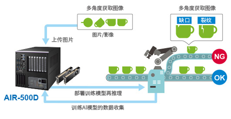 傳統的機器視覺系統有時無法區分缺陷,因為視覺上相似的部件之間也可能存在差異和偏差。通過利用AI技術,可以解決這個問題,并提高整體檢測的精準度。本案例中的客戶是一家機器人視覺設備制造商,他們將自己的機械臂與AI技術相結合,進行檢測缺陷。AIR-500D利用2 x RTX GPU處理不同生產線上捕獲到的大量圖像數據,然后,對這些圖片進行分類、檢測和重新整理,訓練AI模型,提高分析結論的準確性。
