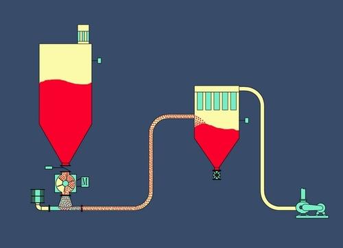 密相氣力輸送原理:密相輸送時,顆粒在少量氣體松弛的流動狀態下進行集體運動,但不是氣體引起的加速,而是通過靜壓差移動。在供給過程中,物料通過氣動閥重力進料到發送罐中,置換出的空氣通過排氣閥排出。發送罐液位計的高警報后,進料完成,進料閥門與排氣閥門同時被關閉,而后通過進氣閥向發送罐頂部及底部加入壓縮氣,加人的壓縮氣與物料相混合,罐內的壓力達到設定值時便自動打開底部出料閥,然后物料以栓狀流形式輸送,直至物料排空,關閉出料閥,完成一次輸送循環,繼續進行下一次輸送循環。密相發送罐氣力輸送有單發送罐輸送和雙發送罐輸送:單發送罐輸送,物料在管道內不是被連續輸送;雙發送罐輸送,因為其中一個發送罐輸送,另一個發送罐進料,兩個發送罐交替操作,物料在管道內連續輸送,可以連續生產。輸送氣體常采用空氣和氮氣,動力一般由壓縮機供給。