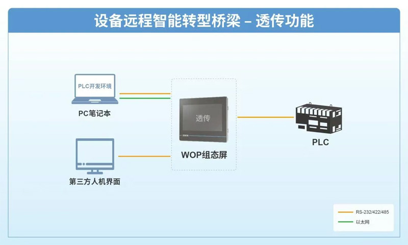 遠程下載維護PLC程序:針對設備管理中的遠程維護問題,WOP提供了透傳功能,作為上位機或第三方人機界面與PLC的通訊中介,無需增加額外硬件即可通過透傳遠程下載并維護PLC程序,實現PLC數據可視化與遠程運維,提升設備智能化程度。