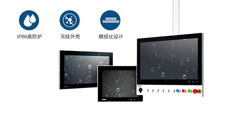 產品采用無風扇式緊湊設計,并支持VESA、桌面及嵌入式安裝,可在各種工業環境中靈活部署。全高清純平面設計以及IP66防護等級前面板可防止水和灰塵進入,更適用圖像處理、視覺成像和數據可視化。產品還提供4:3和16:9等不同比例的尺寸面板,包括:7″、10″、12.1″、15″、17″、23.8″供用戶選擇,以及電容/電阻兩種觸摸方式。