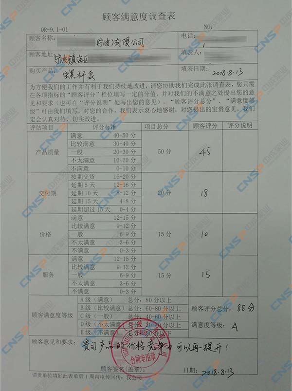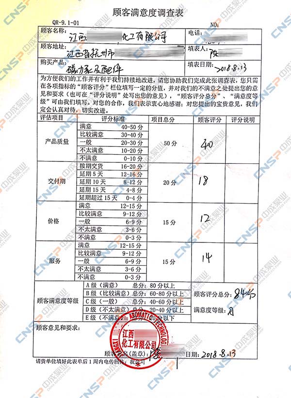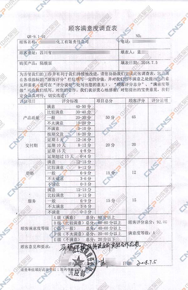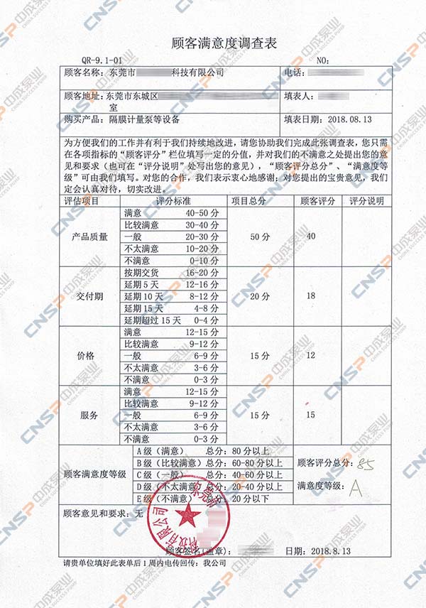 中成泵業從我們的多級泵、計量泵等產品的客戶中抽選幾名進行表格內容調查,客戶反饋成績均為A級,其中螺桿泵、磁力泵、隔膜泵等客戶紛紛表示希望保持合作并對我們的產品持有期望。
