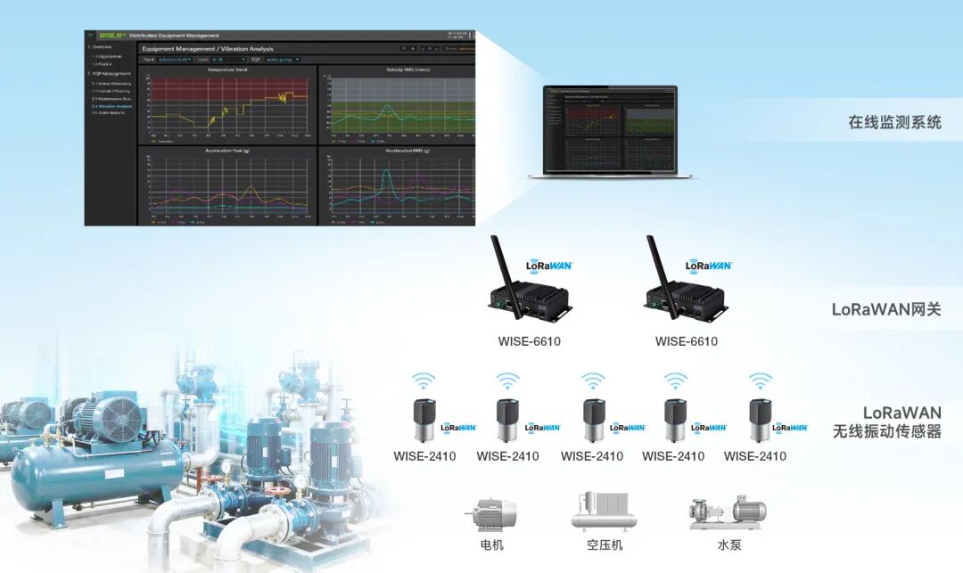 針對(duì)上述痛點(diǎn),該樓宇部署研華設(shè)備振動(dòng)監(jiān)測(cè)方案,通過(guò)“傳感+網(wǎng)關(guān)+平臺(tái)”三層架構(gòu),構(gòu)建覆蓋設(shè)備全生命周期的健康管理體系。